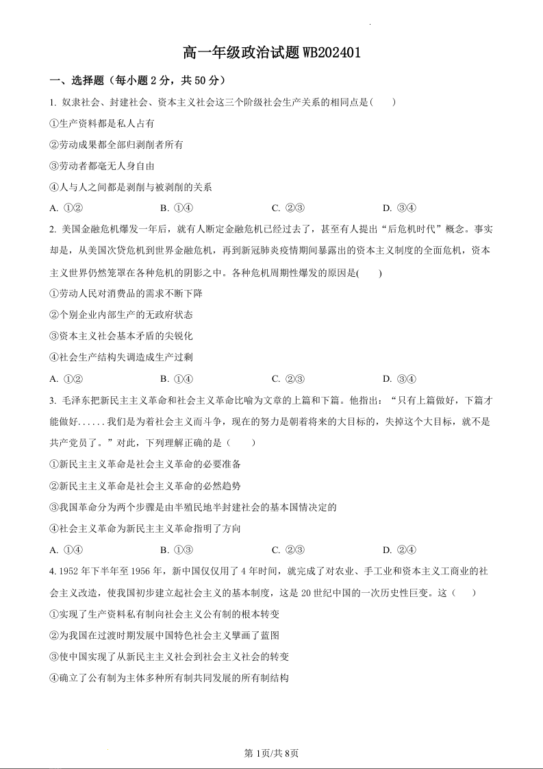 陕西省宝鸡市渭滨区2023-2024学年高一上学期期末考试政治(原卷版)
