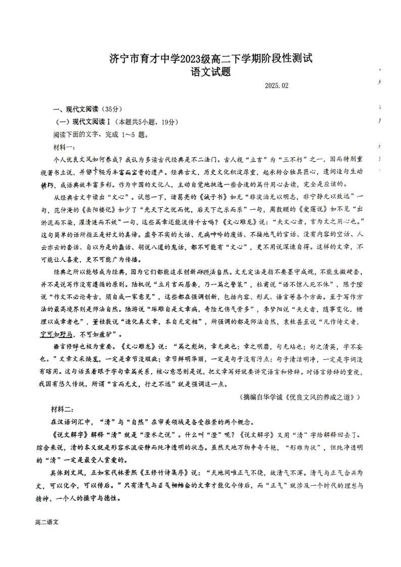山东省济宁市育才中学2024-2025学年下学期高二开学考试语文