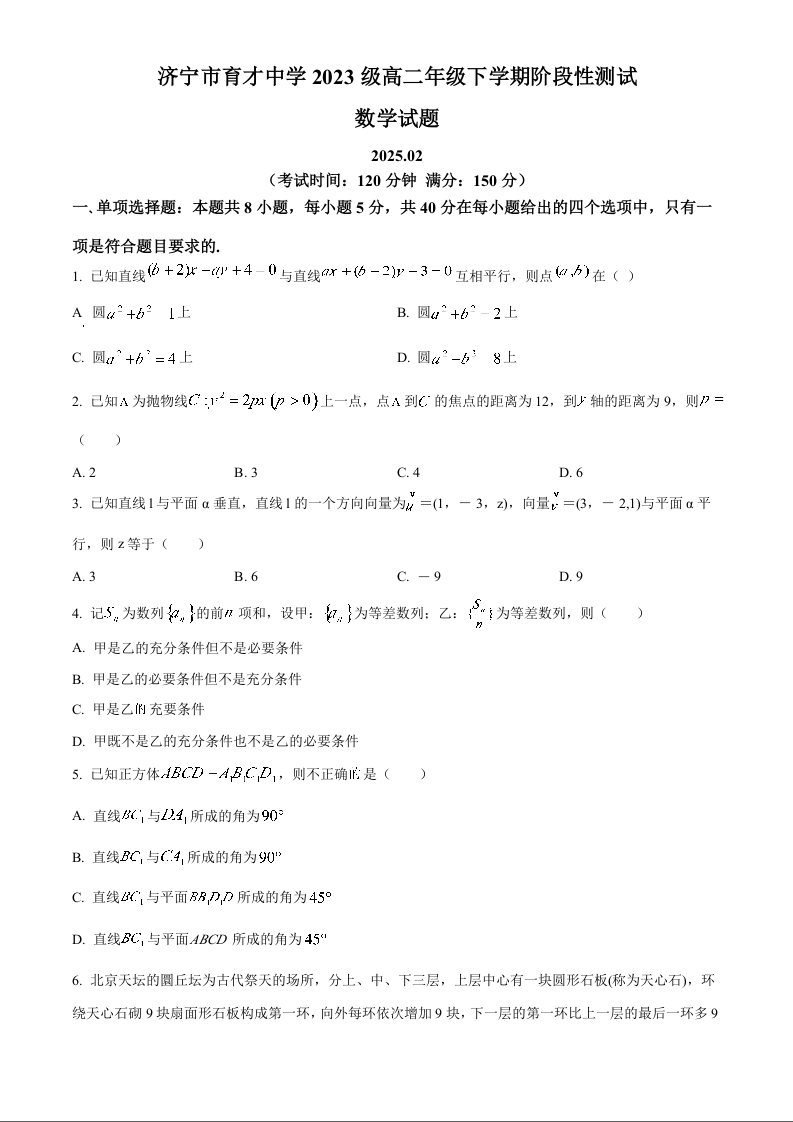 山东省济宁市育才中学2024-2025学年下学期高二开学考试数学(原卷版)