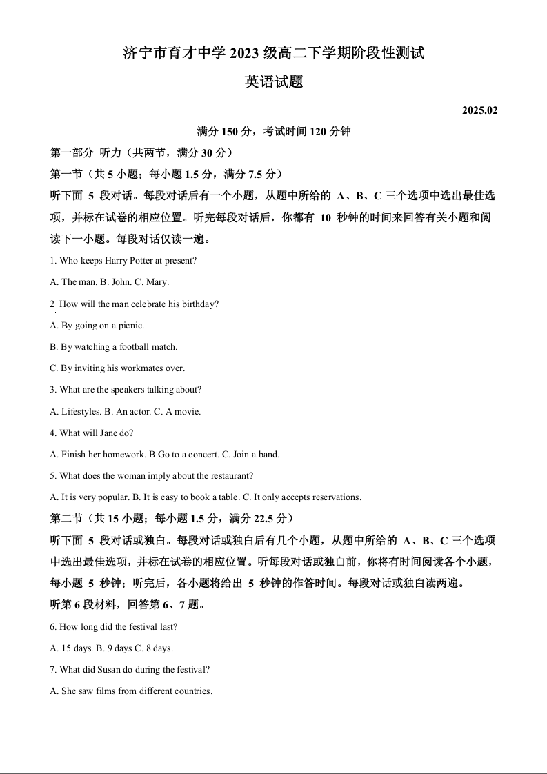 山东省济宁市育才中学2024-2025学年下学期高二开学考试英语(解析版)