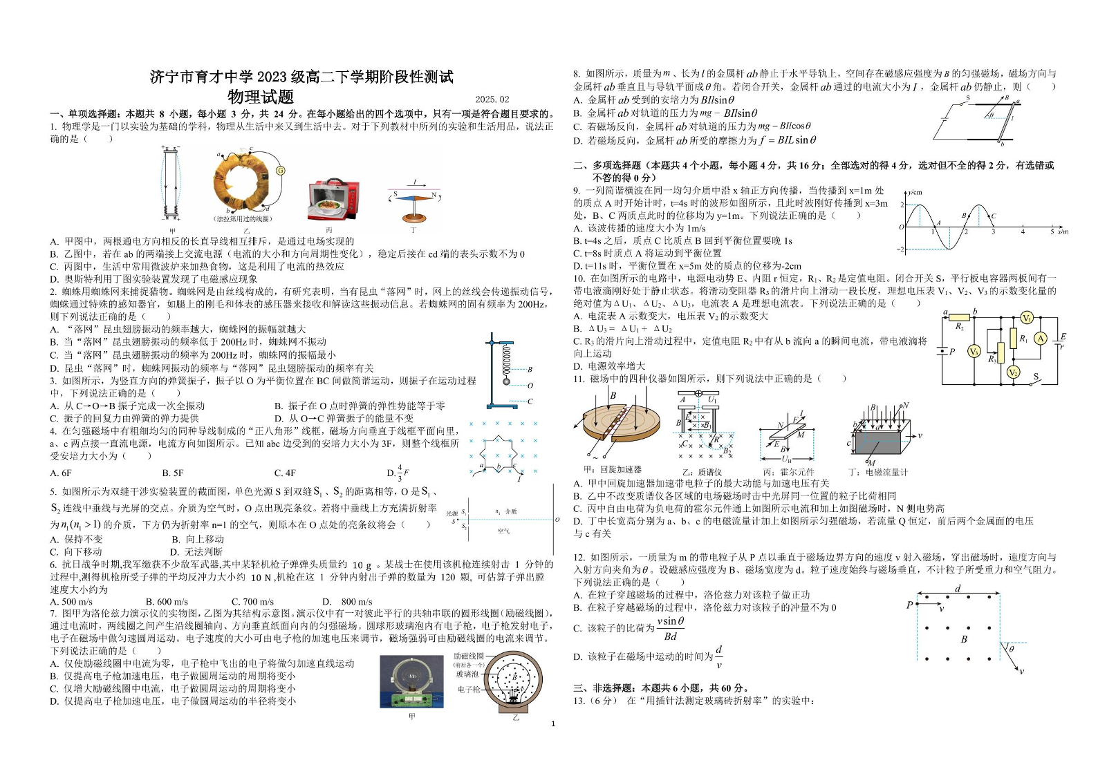 山东省济宁市育才中学2024-2025学年下学期高二开学考试物理