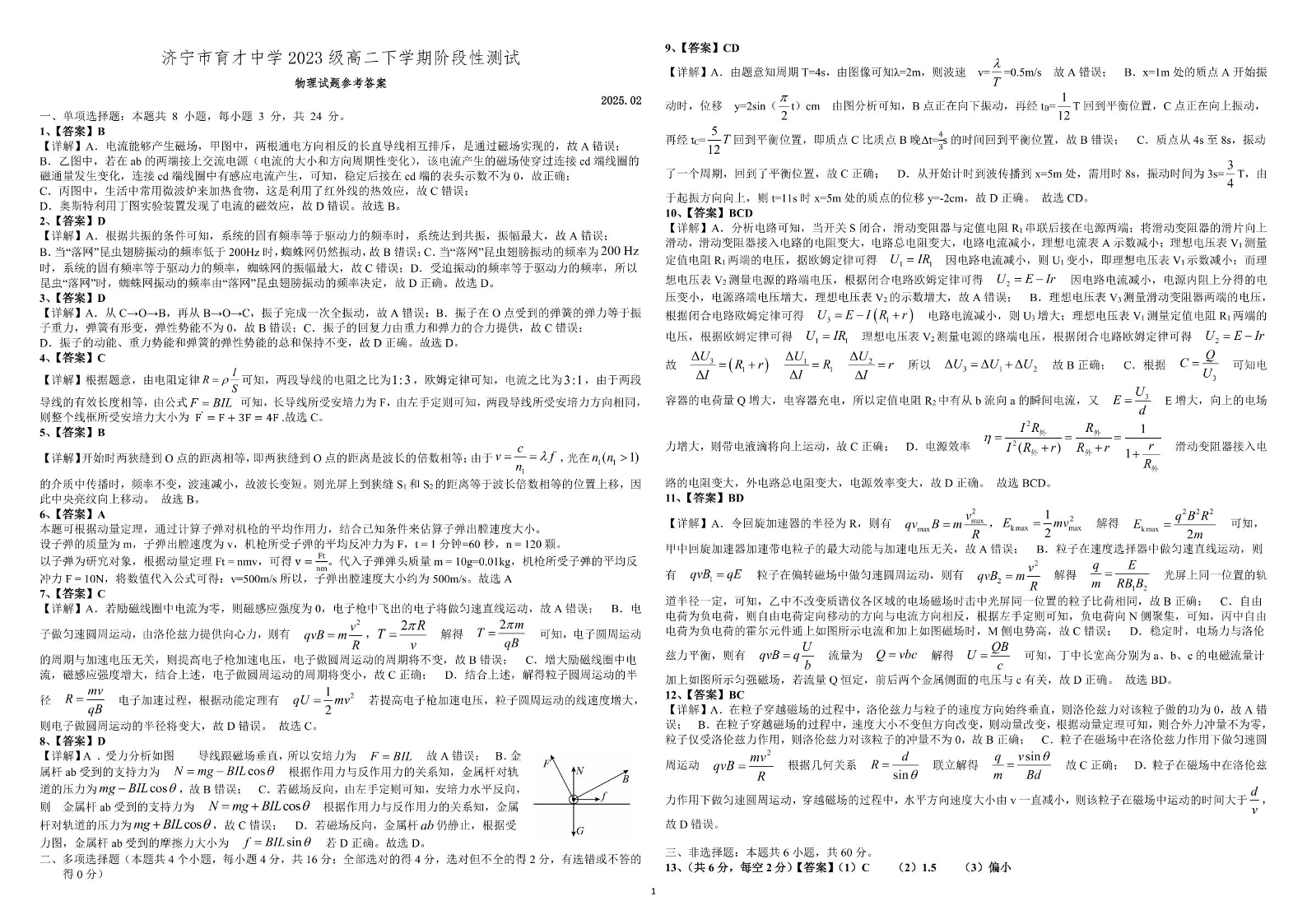 山东省济宁市育才中学2024-2025学年下学期高二开学考试物理答案