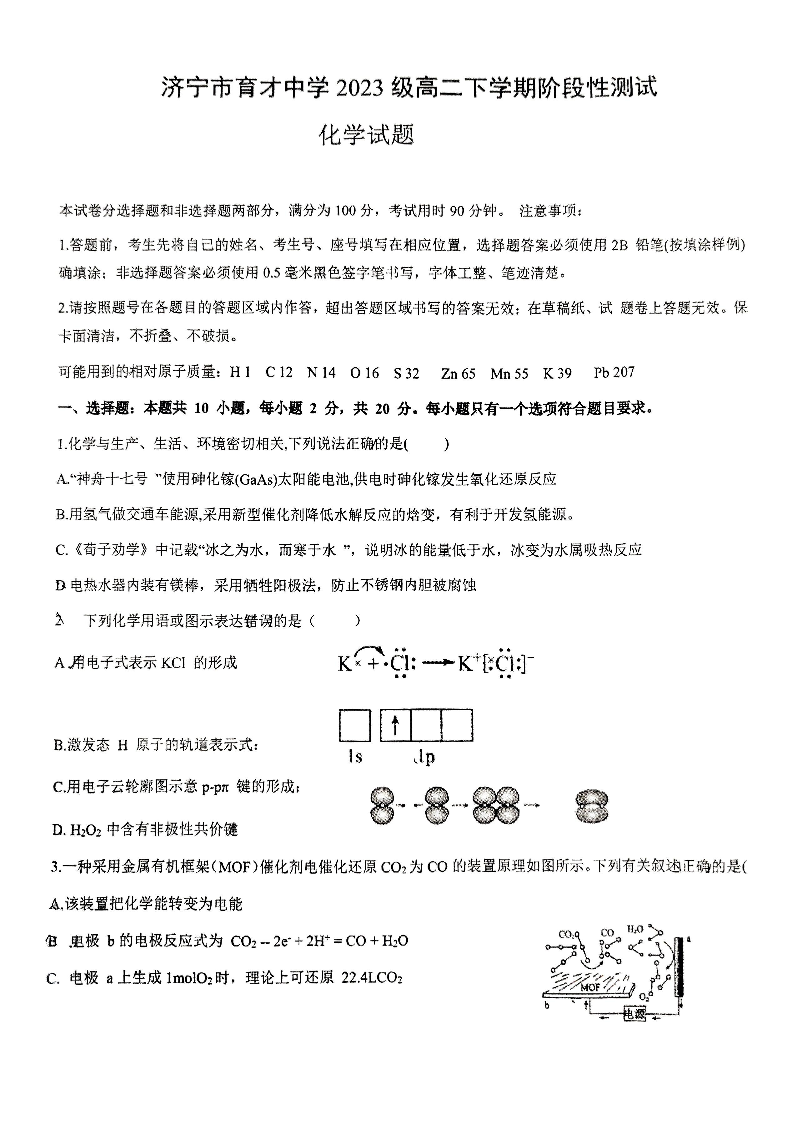 山东省济宁市育才中学2024-2025学年下学期高二开学考试化学
