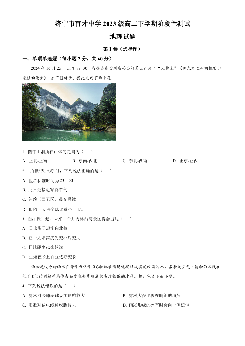 山东省济宁市育才中学2024-2025学年下学期高二开学考试地理(原卷版)