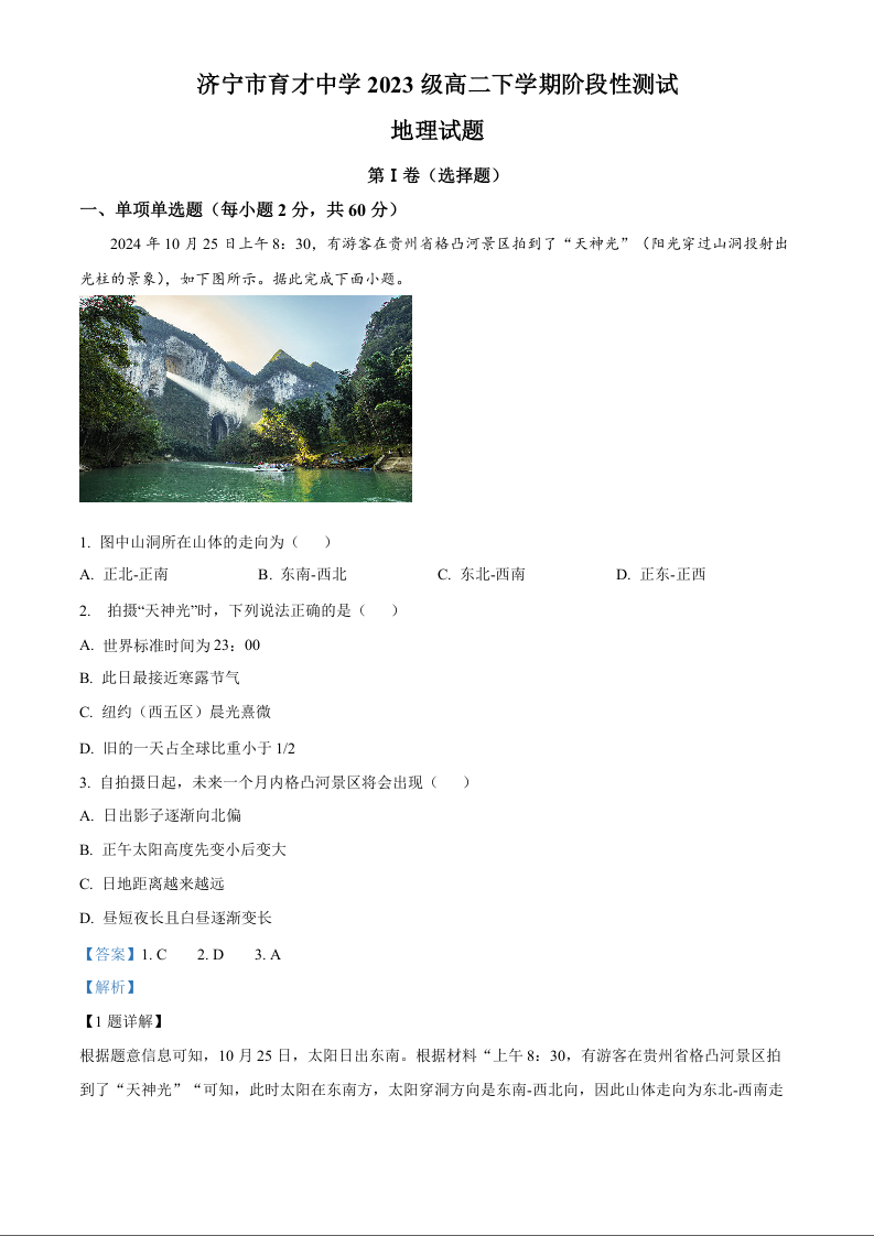 山东省济宁市育才中学2024-2025学年下学期高二开学考试地理(解析版)