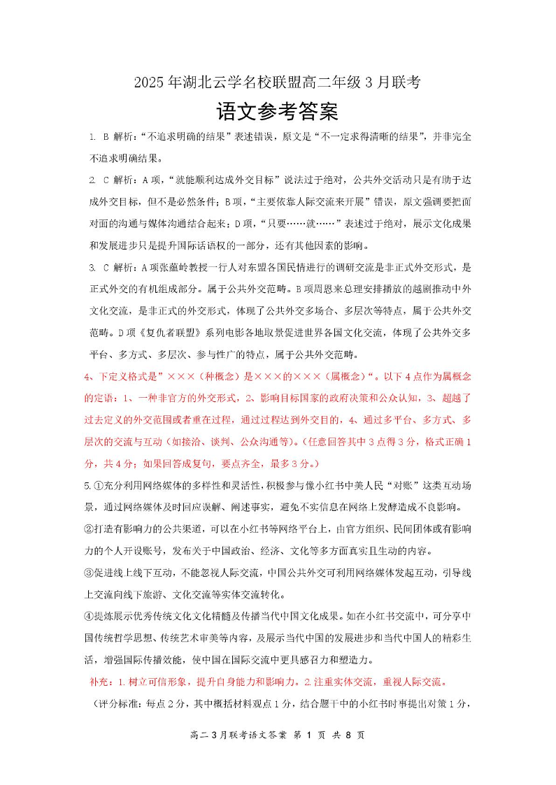 湖北省云学名校联盟2024-2025学年下学期3月高二联考语文答案