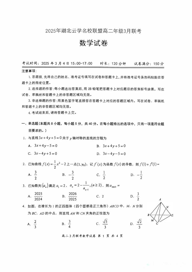 湖北省云学名校联盟2024-2025学年下学期3月高二联考数学