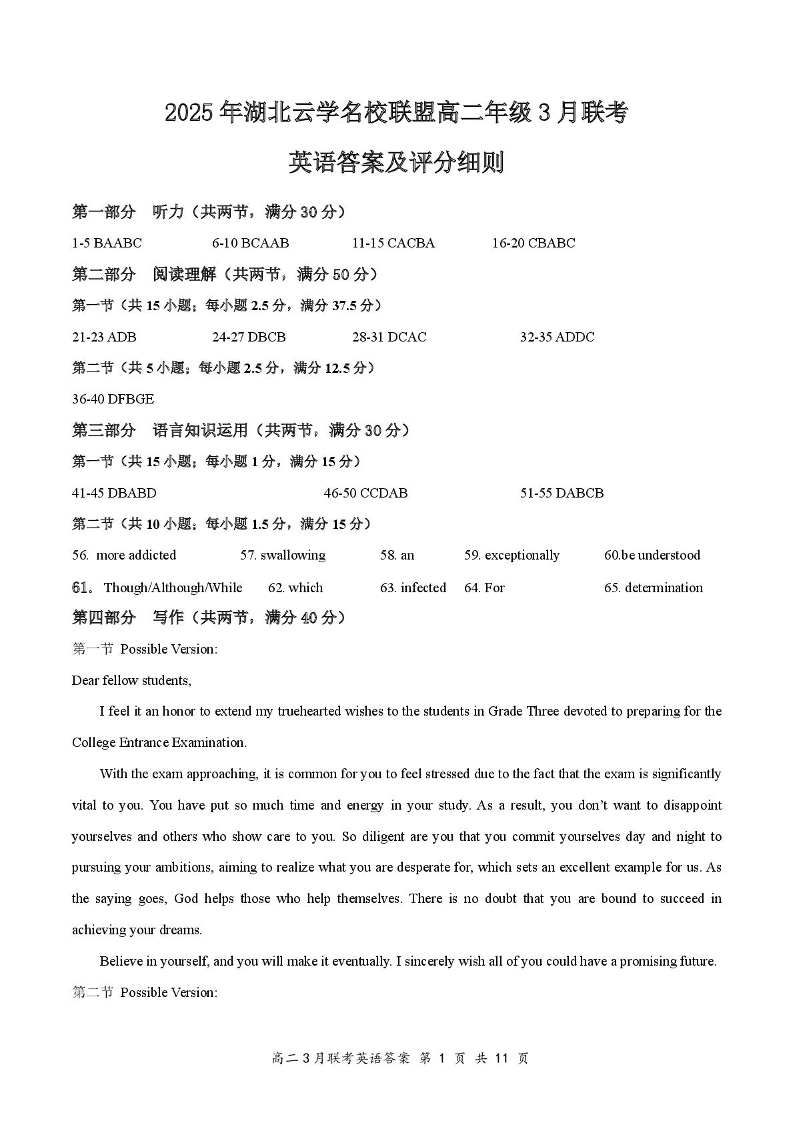 湖北省云学名校联盟2024-2025学年下学期3月高二联考英语答案