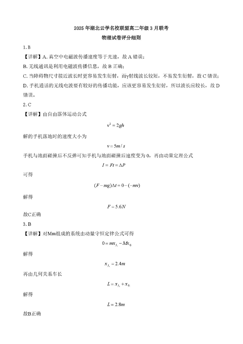 湖北省云学名校联盟2024-2025学年下学期3月高二联考物理答案