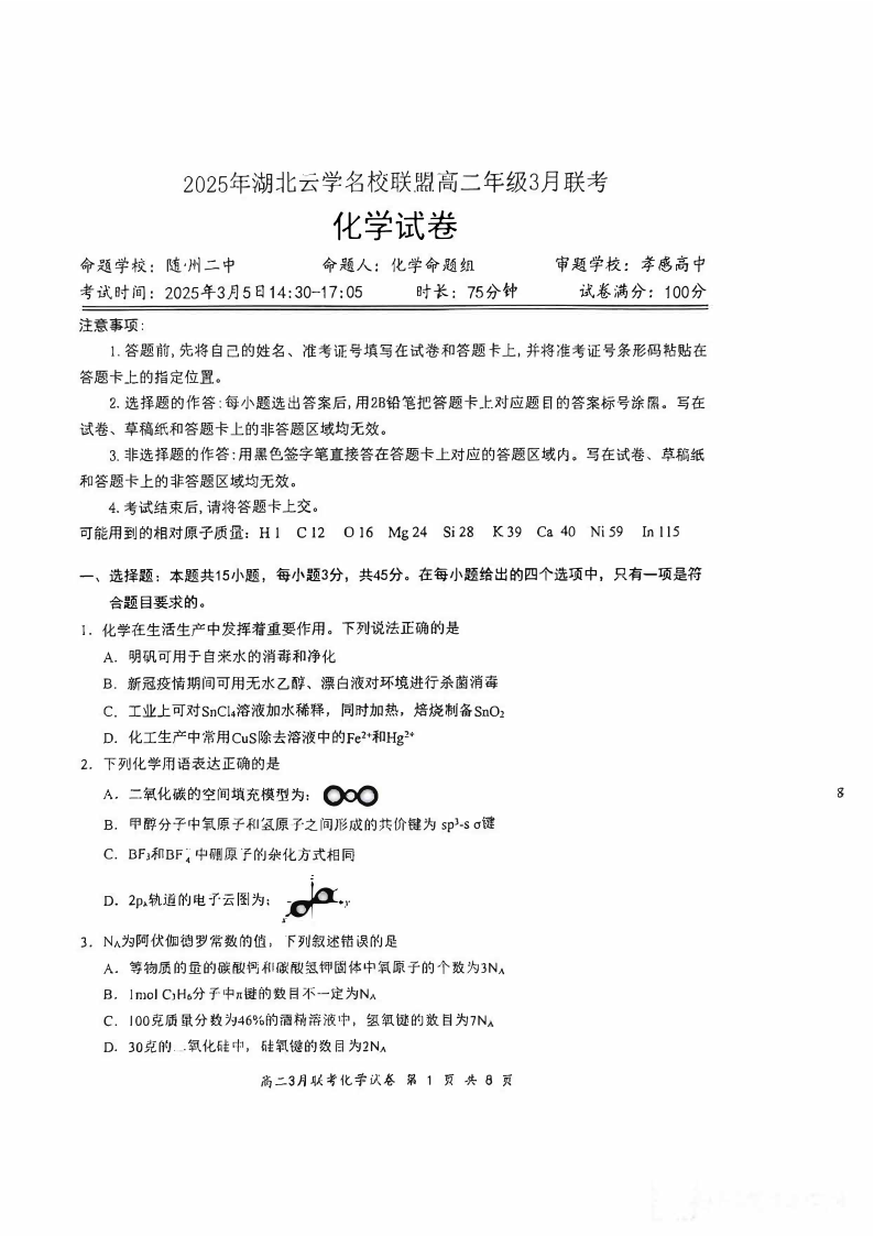 湖北省云学名校联盟2024-2025学年下学期3月高二联考化学