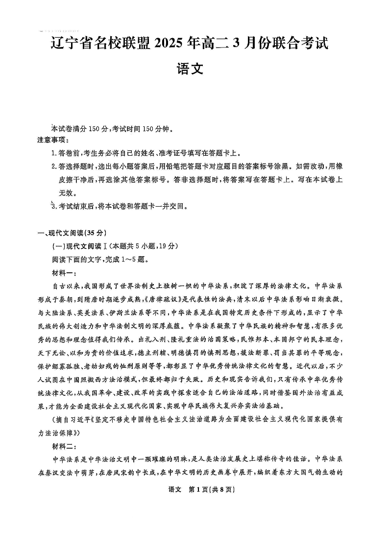 辽宁省名校联盟2024-2025学年下学期3月高二联合考试语文