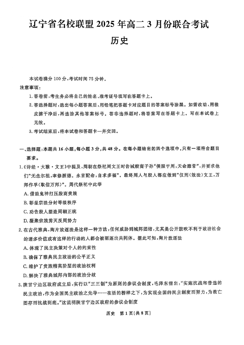 辽宁省名校联盟2024-2025学年下学期3月高二联合考试历史