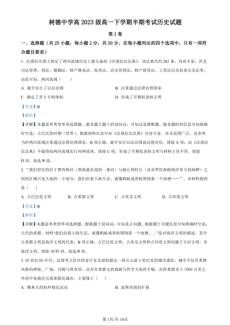 四川省成都市树德中学2023-2024学年高一下学期5月期中考试历史(精品解析版)
