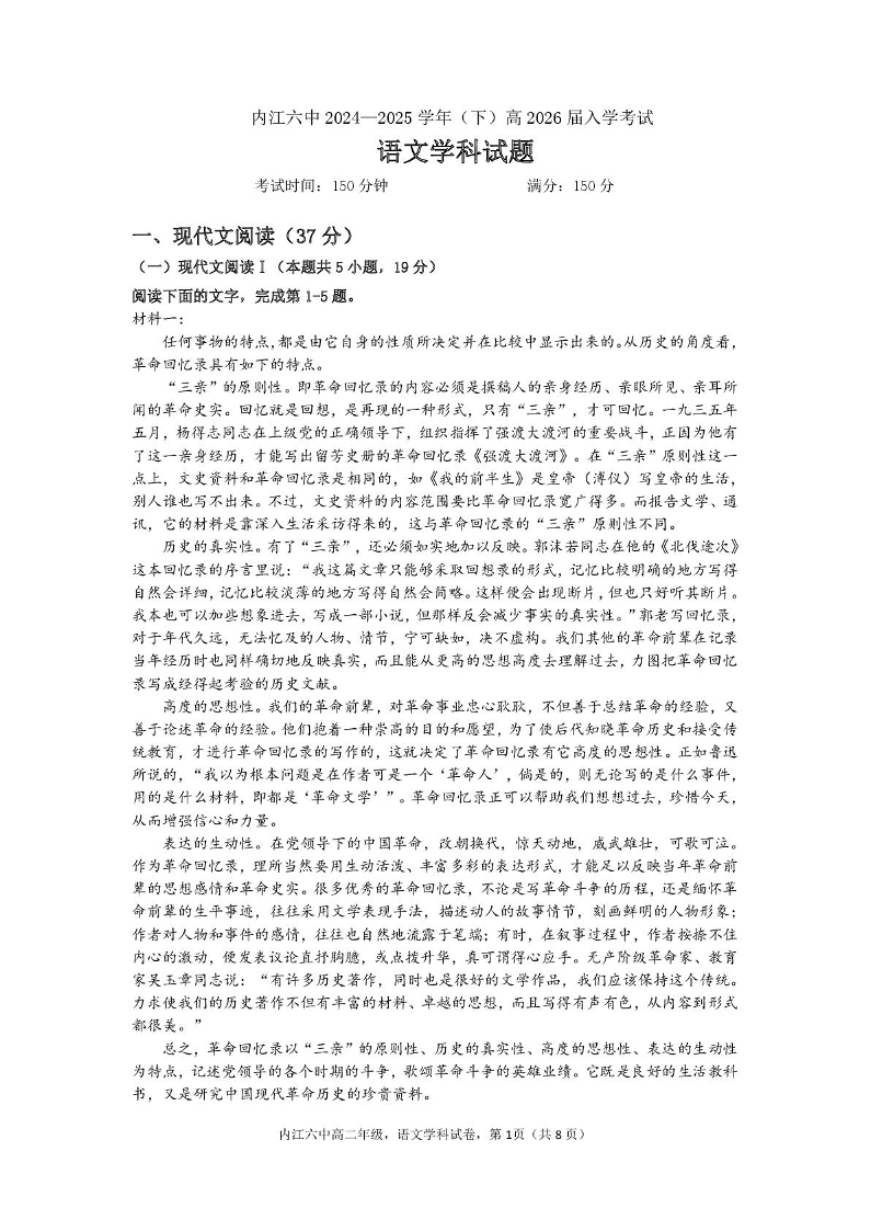 四川省内江市第六中学2024-2025学年下学高二期入学考试语文