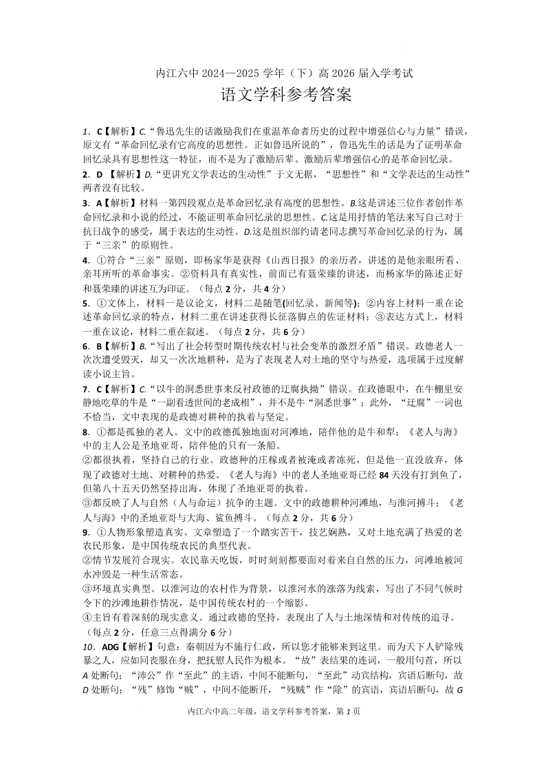 四川省内江市第六中学2024-2025学年下学高二期入学考试语文答案