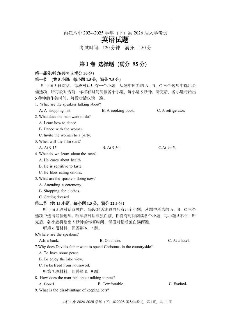 四川省内江市第六中学2024-2025学年下学高二期入学考试英语