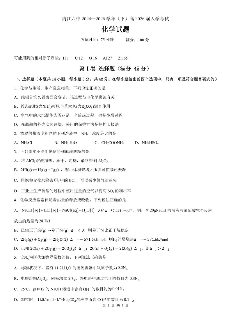 四川省内江市第六中学2024-2025学年下学高二期入学考试化学