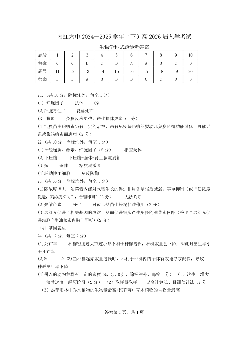 四川省内江市第六中学2024-2025学年下学高二期入学考试生物答案