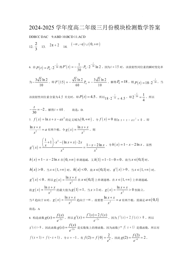 山东省济宁市实验中学2024-2025学年下学期3月高二月考数学答案