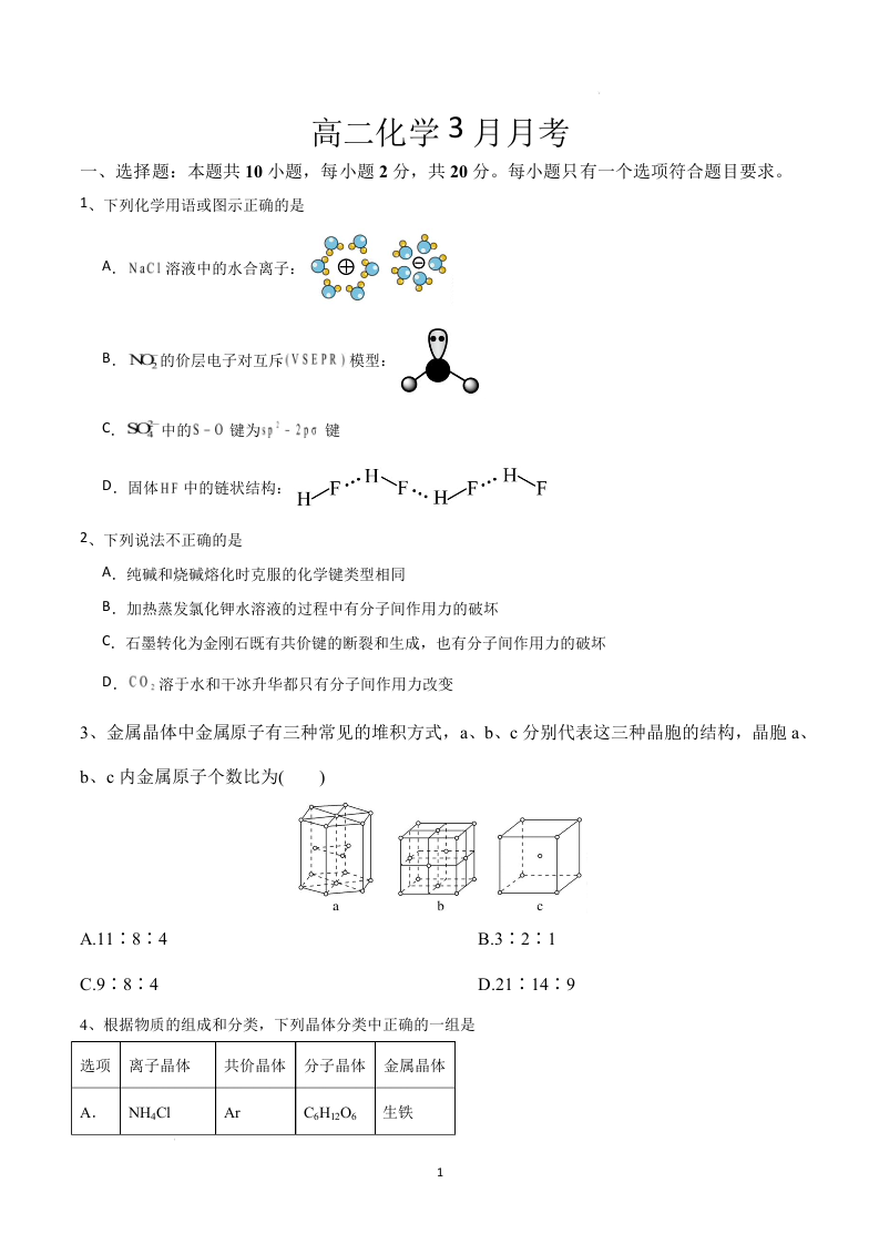 山东省济宁市实验中学2024-2025学年下学期3月高二月考化学