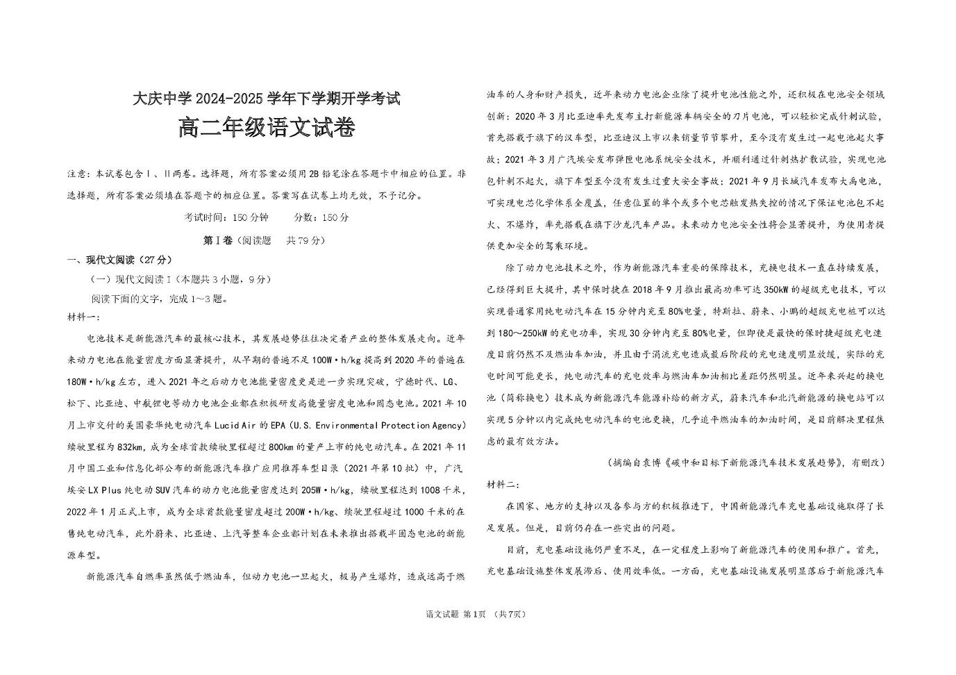 黑龙江省大庆市大庆中学2024-2025学年下学期高二开学测试语文