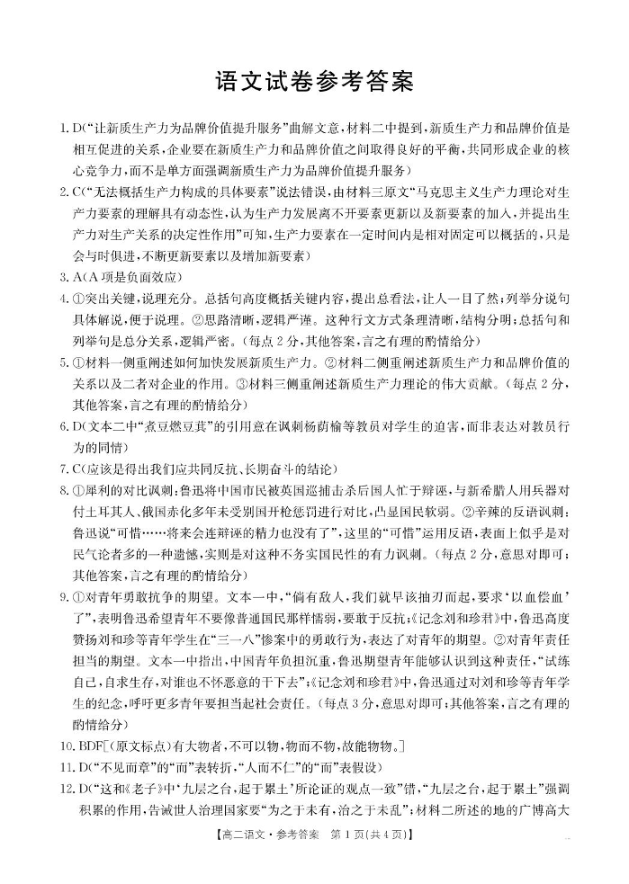 辽宁省抚顺市六校协作体2024-2025学年下学期高二期初检测语文答案