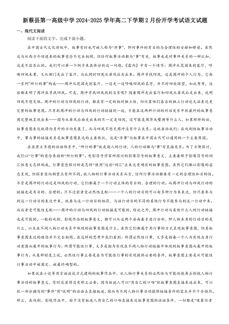 河南省驻马店市新蔡县一中2024-2025学年下学期2月高二月考语文+答案