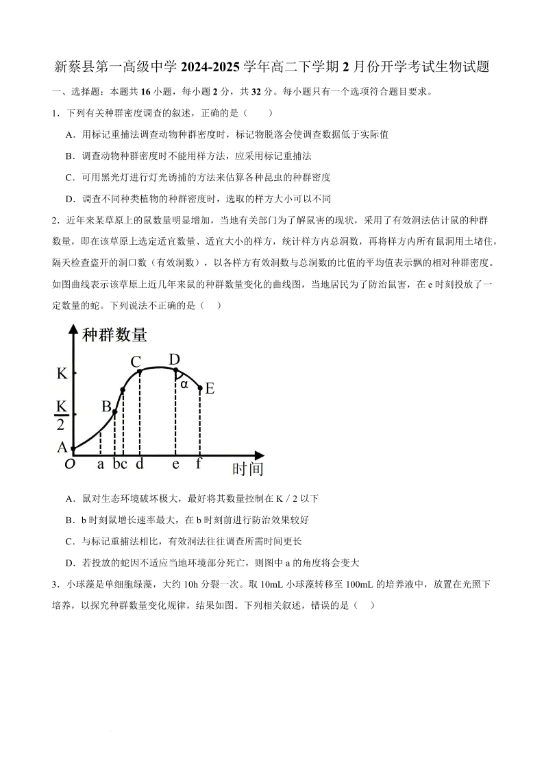 河南省驻马店市新蔡县一中2024-2025学年下学期2月高二月考生物+答案