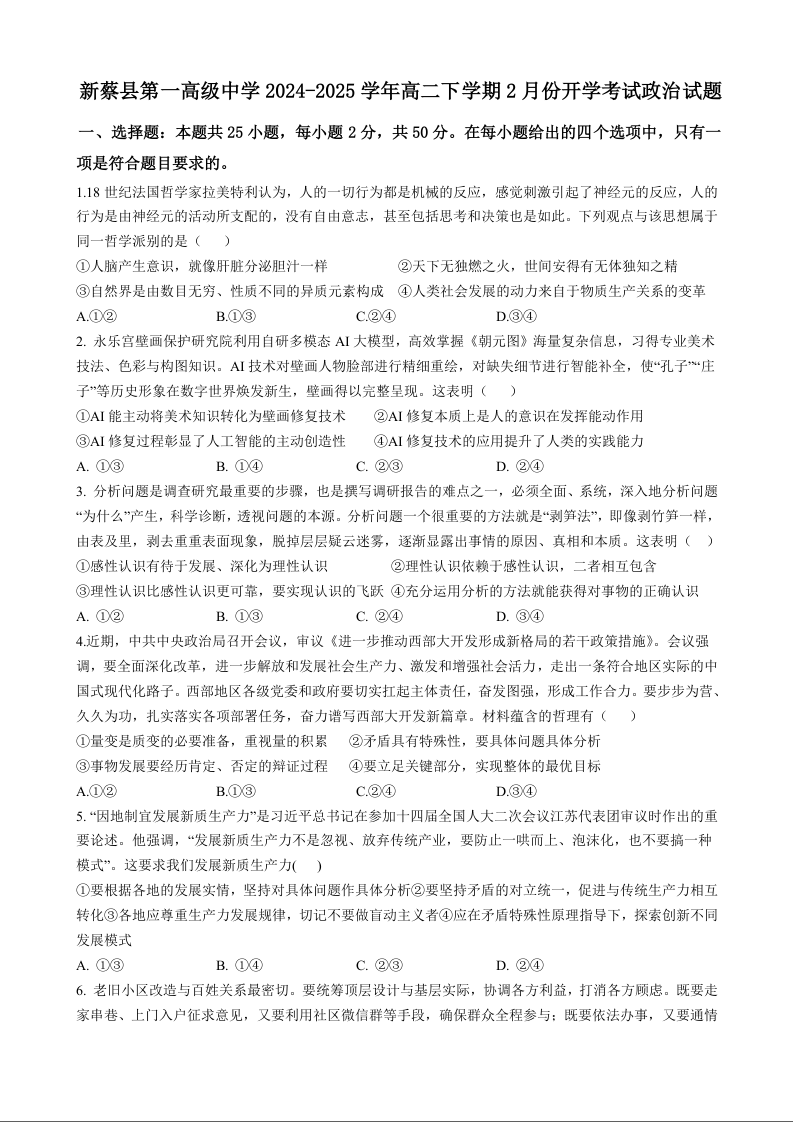河南省驻马店市新蔡县一中2024-2025学年下学期2月高二月考政治+答案