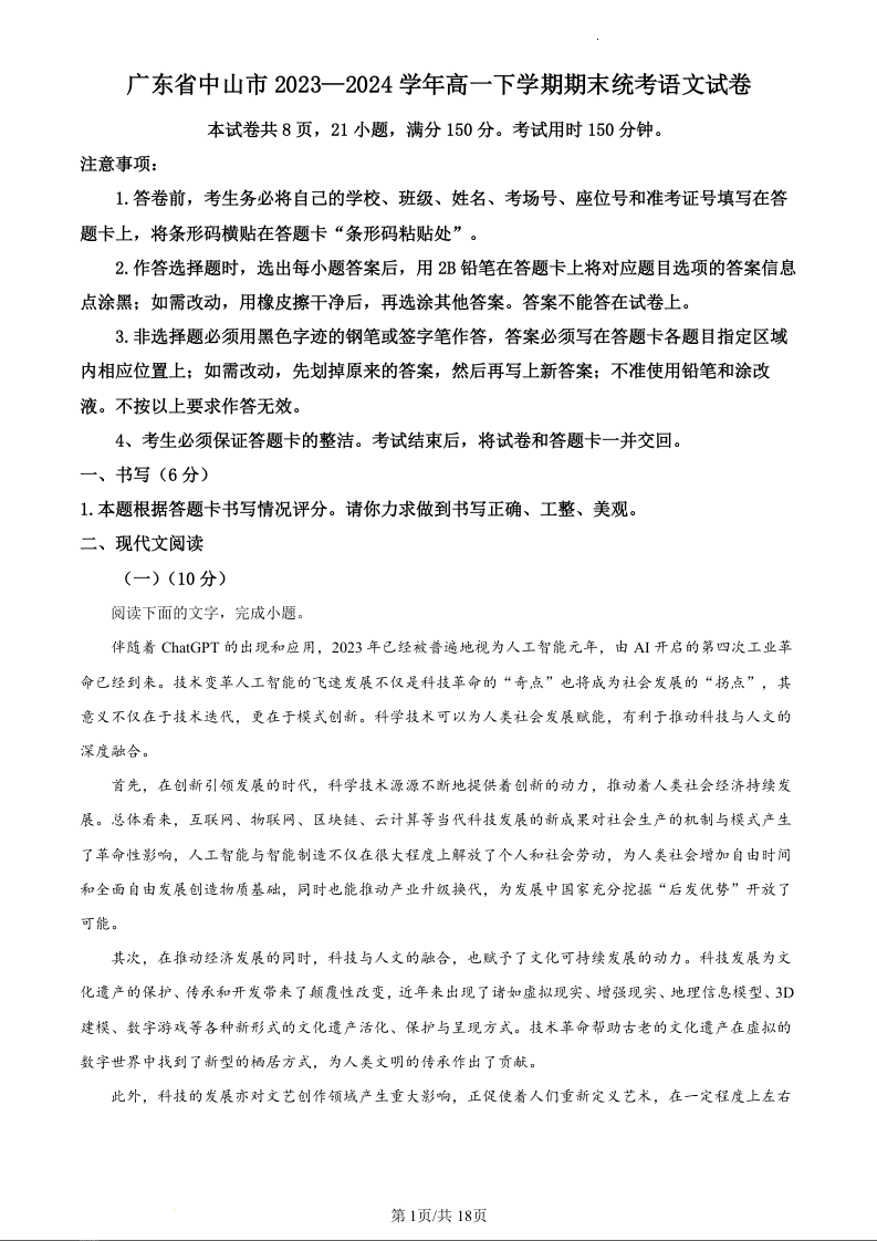 广东省中山市2023-2024学年高一下学期期末统一考试语文(精品解析版)