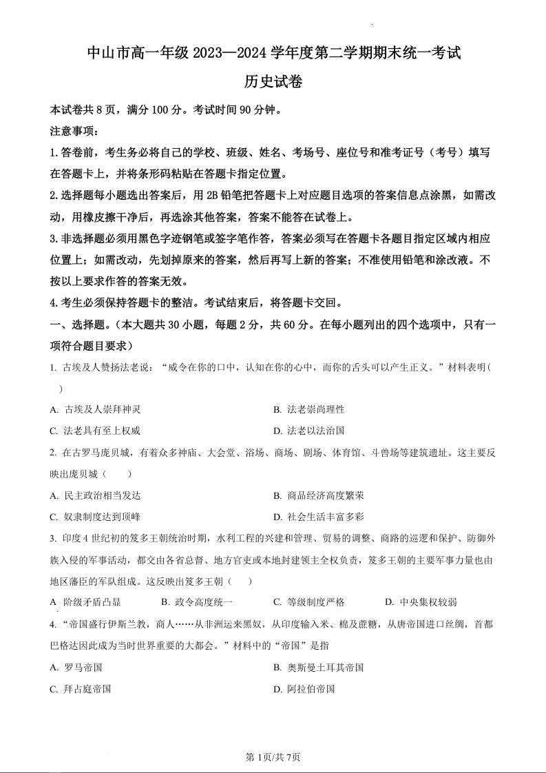 广东省中山市2023-2024学年高一下学期期末统一考试历史(原卷版)