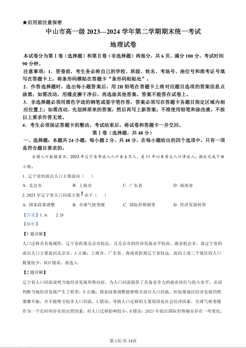 广东省中山市2023-2024学年高一下学期期末统一考试地理(精品解析版)