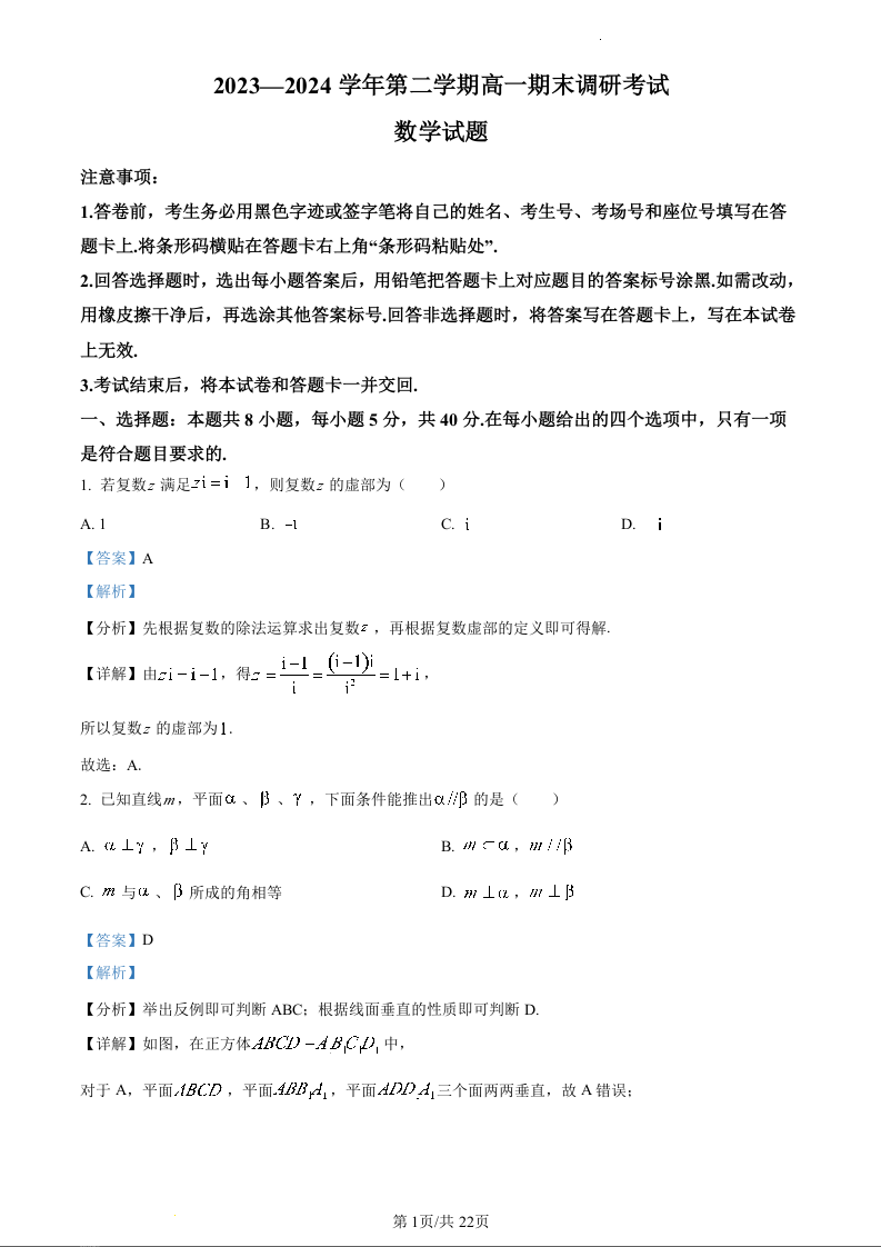 河北省保定市2023-2024学年高一下学期期末调研考试数学(精品解析版)