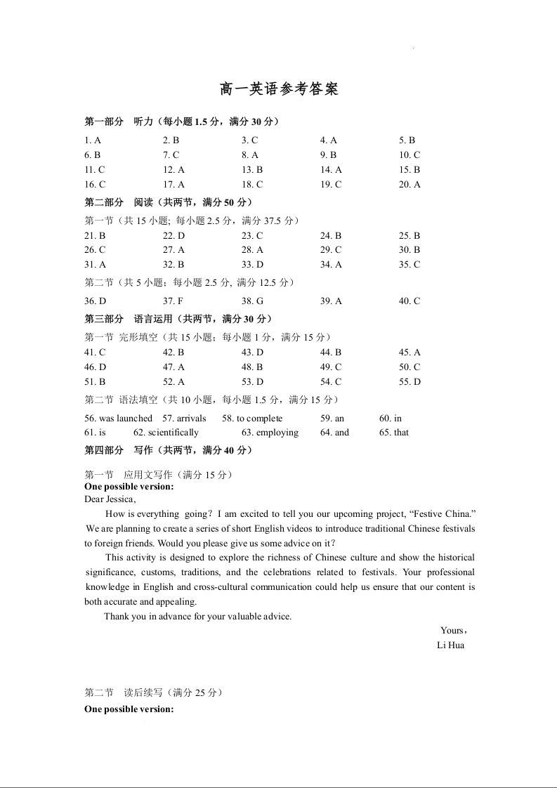 河北省保定市2023-2024学年高一下学期期末调研考试英语答案