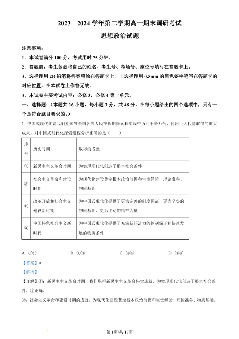 河北省保定市2023-2024学年高一下学期期末调研考试政治(精品解析版)