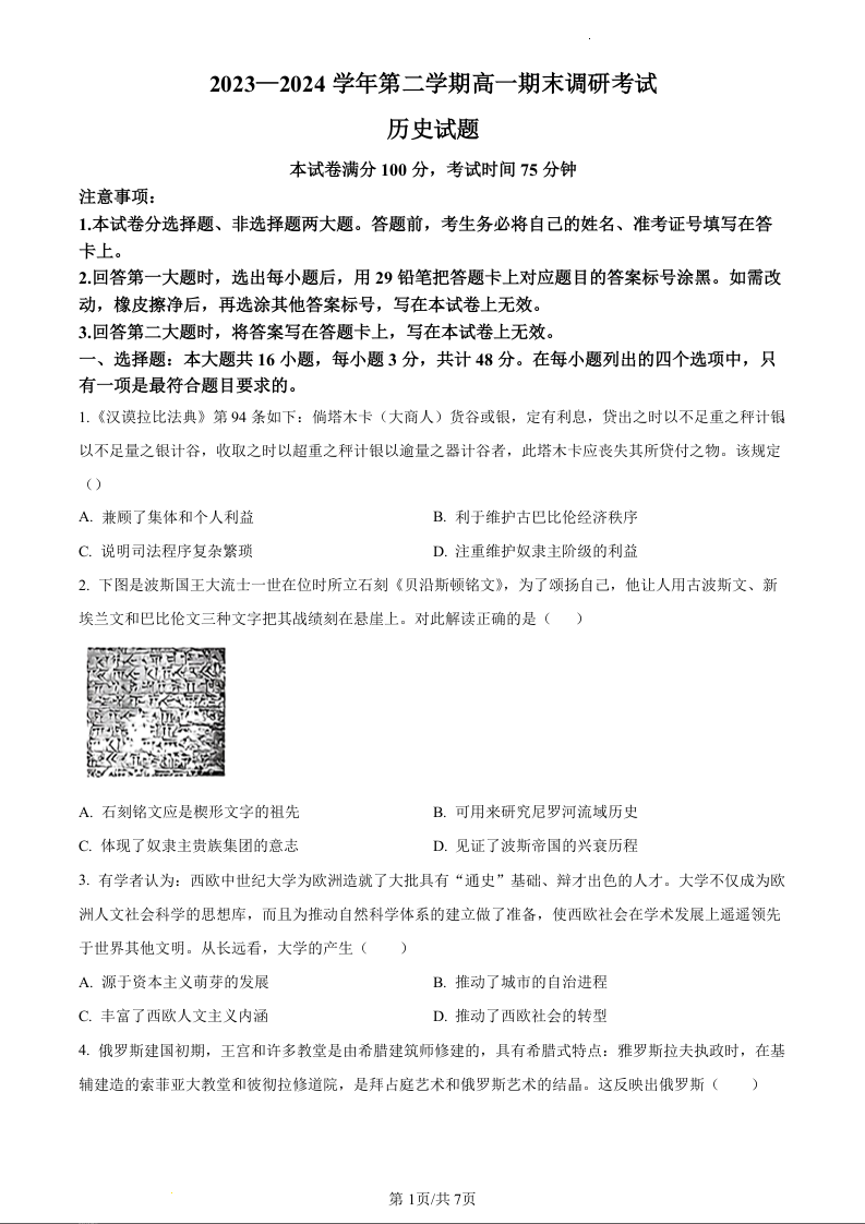 河北省保定市2023-2024学年高一下学期期末调研考试历史(原卷版)