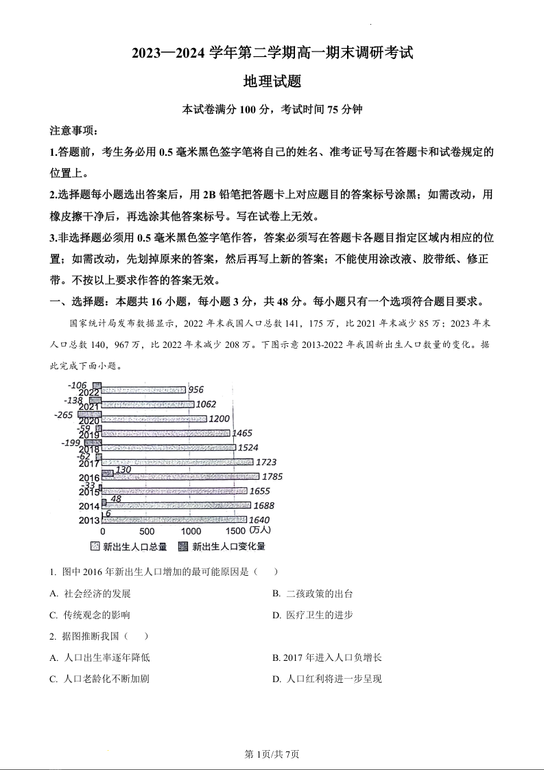 河北省保定市2023-2024学年高一下学期期末调研考试地理(原卷版)