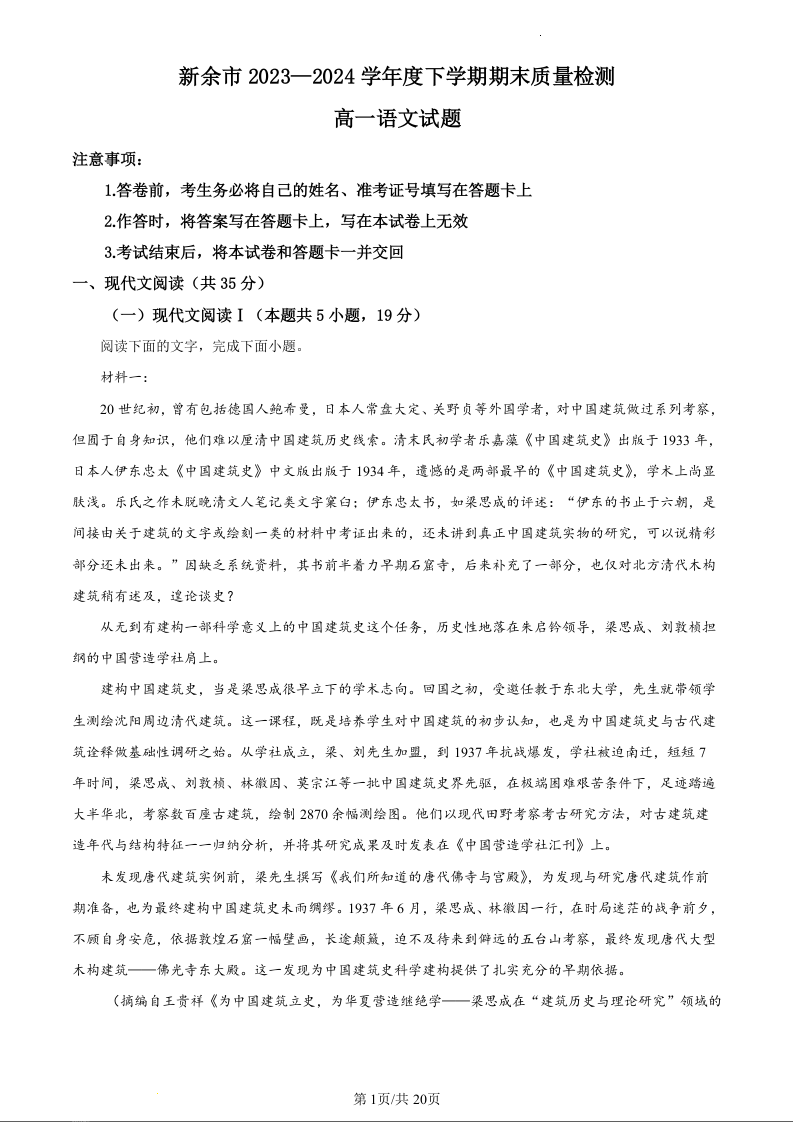 江西省新余市2023-2024学年高一下学期期末考试语文(精品解析版)