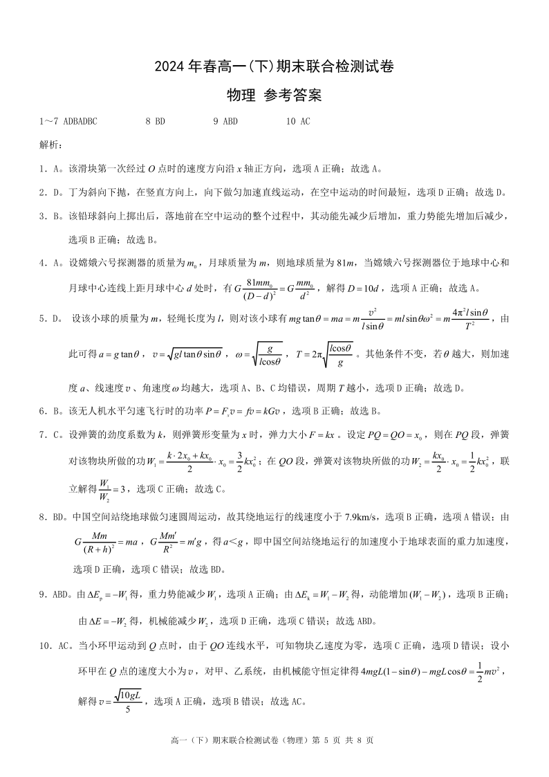 重庆康德卷2024年春高一(下)期末联合检测物理答案