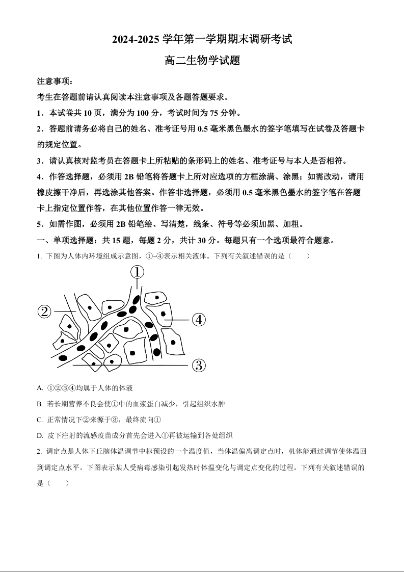 江苏省连云港市2024-2025学年上学期1月高二期末考试生物(原卷版)