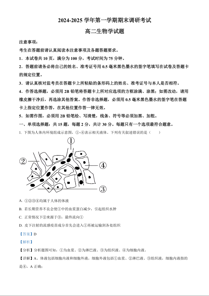 江苏省连云港市2024-2025学年上学期1月高二期末考试生物(解析版)