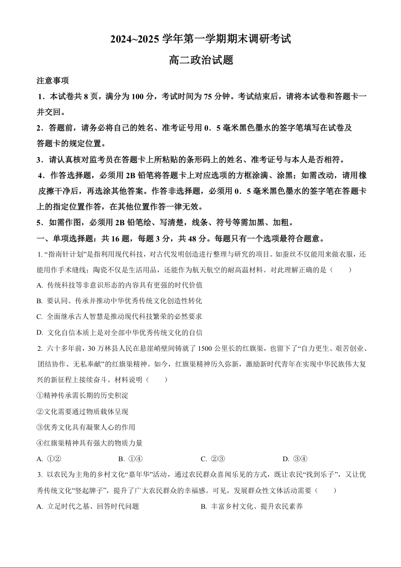 江苏省连云港市2024-2025学年上学期1月高二期末考试政治(原卷版)