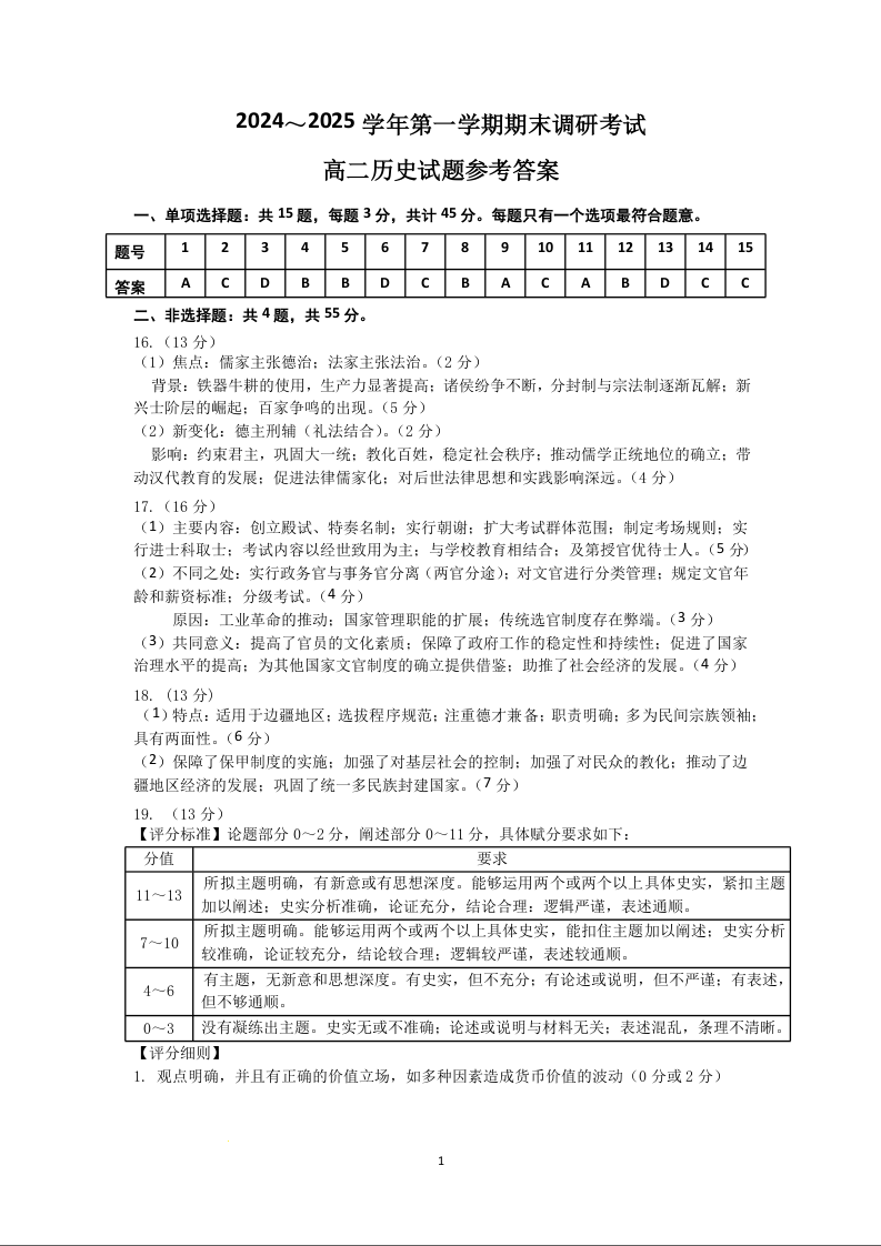 江苏省连云港市2024-2025学年上学期1月高二期末考试历史答案