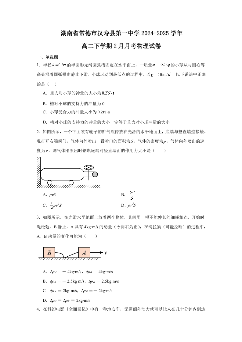 湖南省常德市汉寿一中2024-2025学年下学期2月高二月考物理+答案