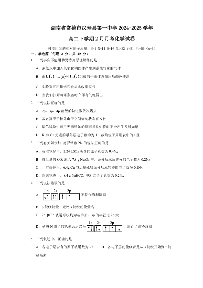 湖南省常德市汉寿一中2024-2025学年下学期2月高二月考化学+答案