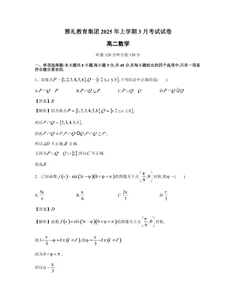 湖南省长沙市雅礼集团2024-2025学年下学期3月高二月考数学 (解析版)