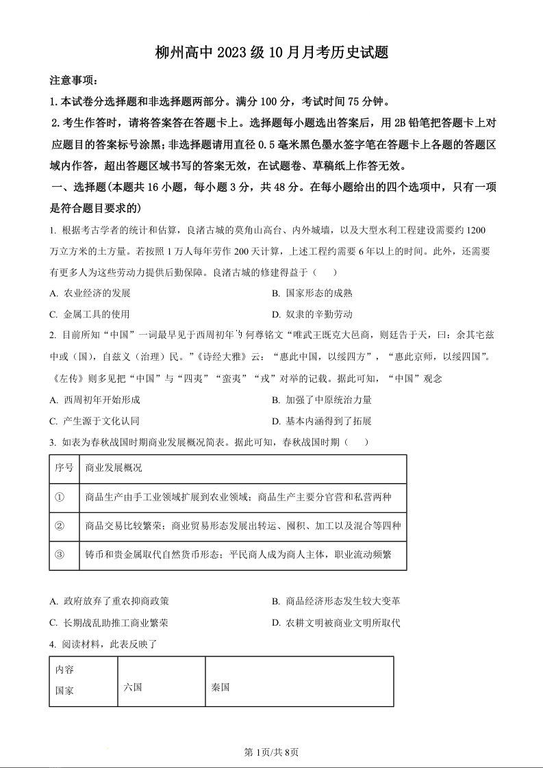广西柳州高级中学2023-2024学年高一上学期10月月考历史(原卷版)
