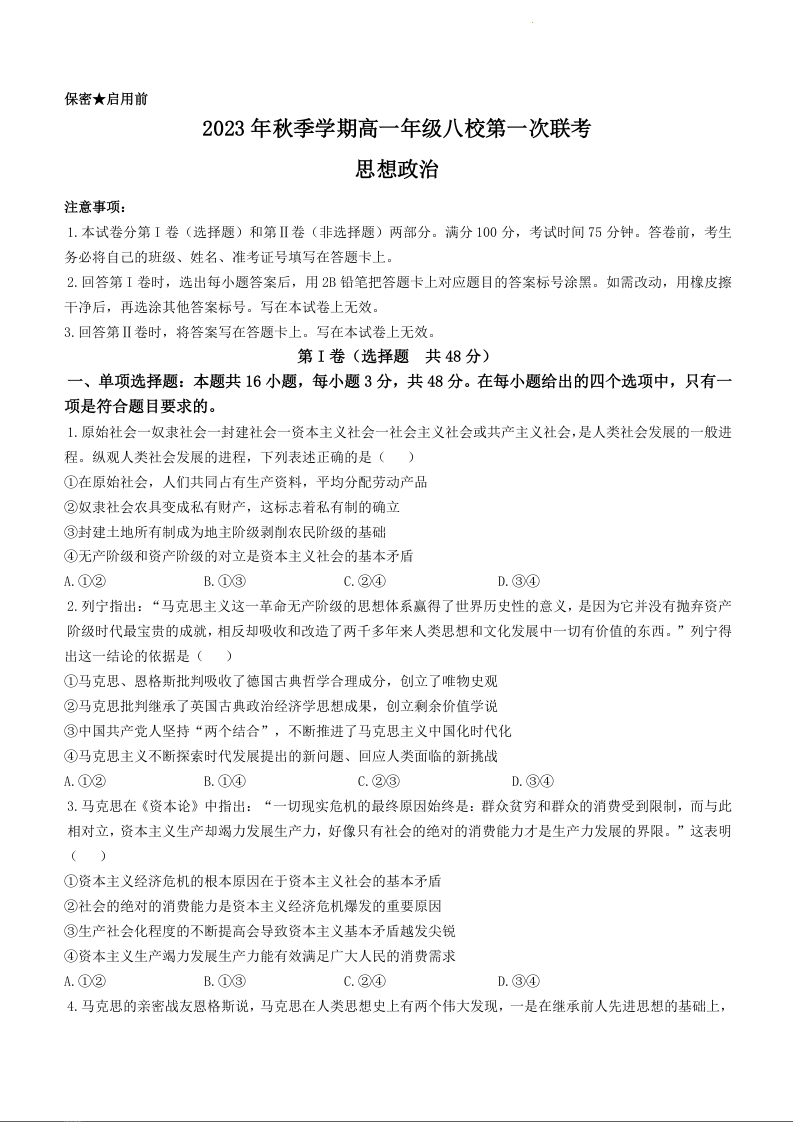 广西壮族自治区河池市八校联考2023-2024学年高一上学期10月月考政治+答案