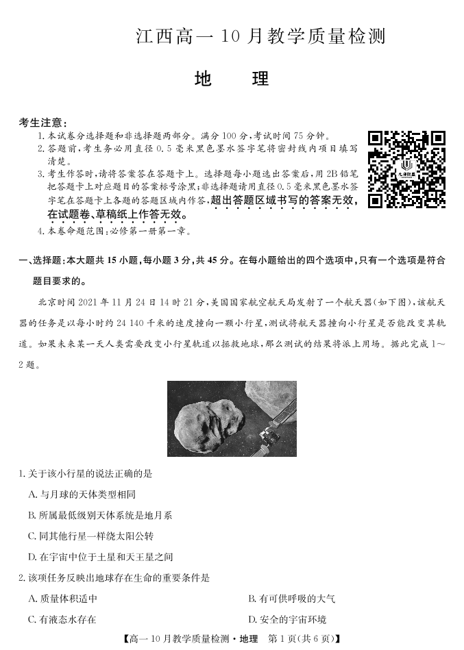 江西省名校联盟2023-2024学年高一上学期10月质量检测地理