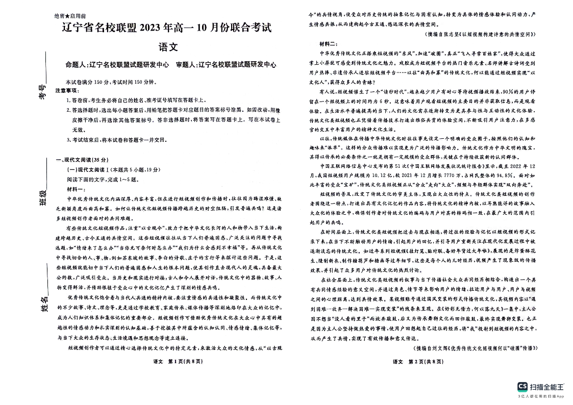 辽宁省名校联盟2023-2024学年高一上学期10月份联考语文
